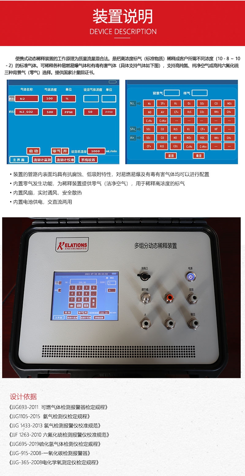 便攜式氣體配氣儀采用質量流量混合法的原理,把高濃度的标準氣體稀釋成客戶所需的不同濃度标準氣體,稀釋氣體可采用高純氮氣、純淨空氣等、組分氣可爲純氣或已知的标氣。該裝置廣泛适用于各省市計量檢定機構和從事檢定校準工作的第三方企業對氣體報警器的計量檢定校準工作。